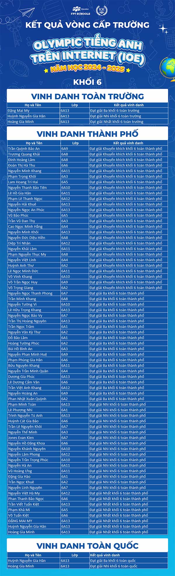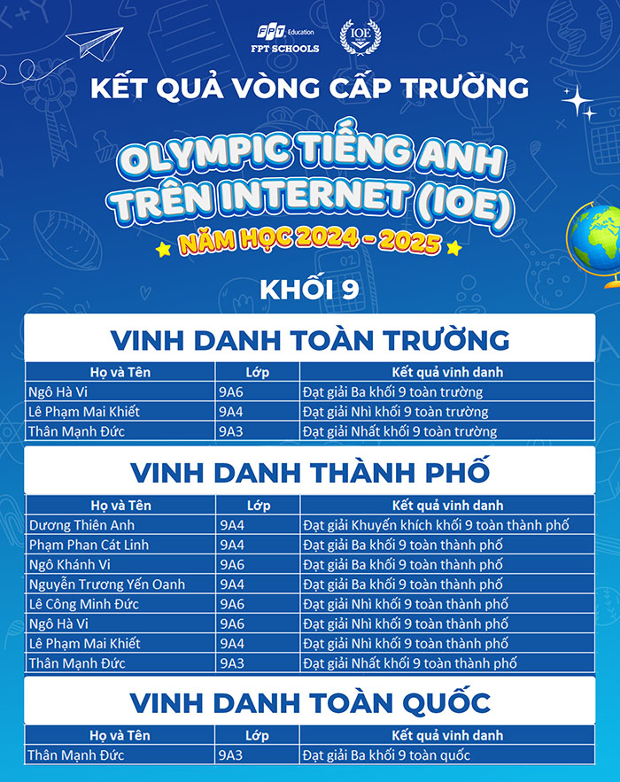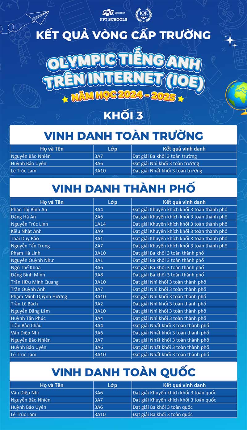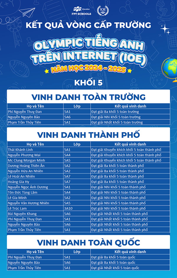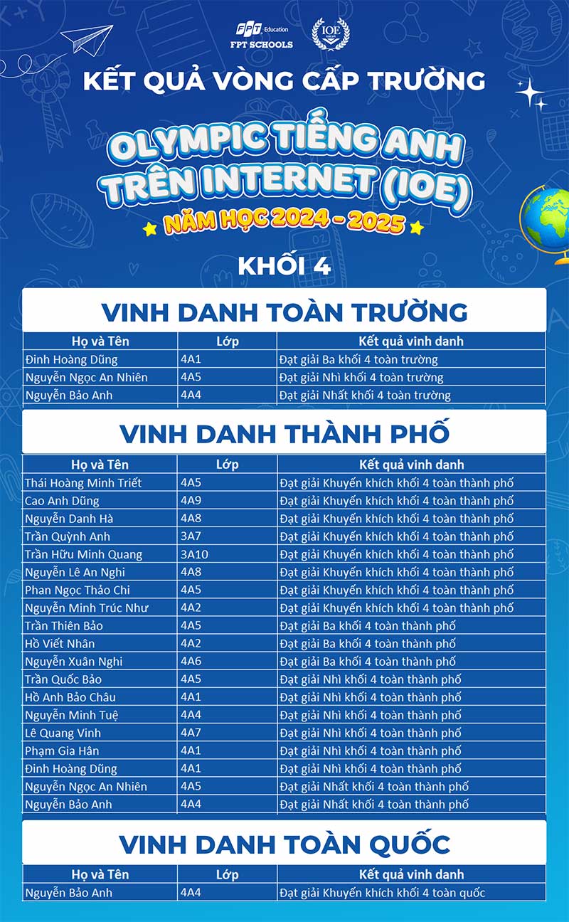 Năm nay, gần 550 Fschoolers đã tham gia vòng thi cấp trường IOE tại Trường TH & THCS FPT Đà Nẵng. Các em đã nỗ lực vượt qua các thử thách và đạt được thành tích ấn tượng, với nhiều bạn đạt thứ hạng cao toàn thành phố và toàn quốc. Chúng tôi xin chúc mừng những học sinh xuất sắc đã ghi tên mình vào bảng xếp hạng.