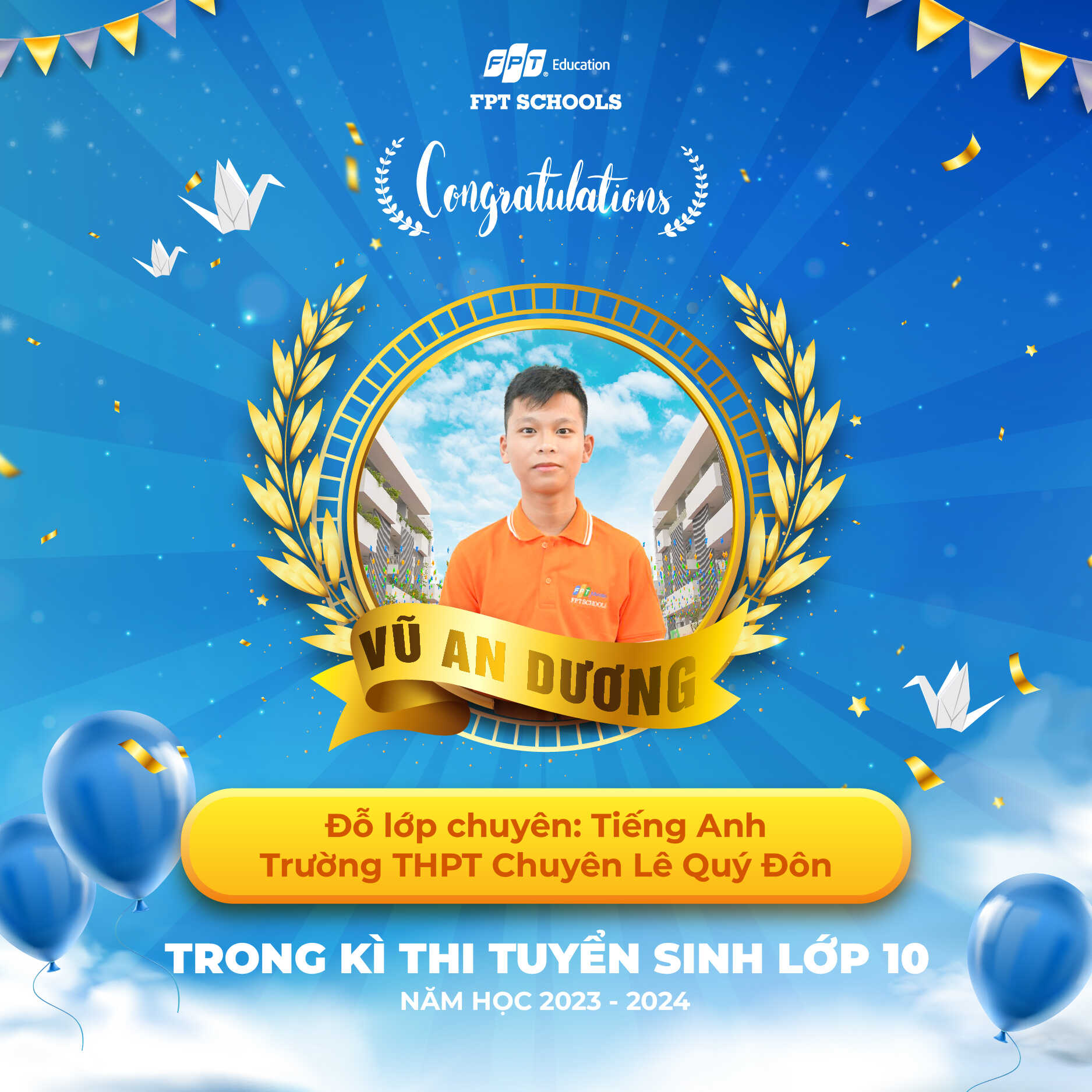 Trước khi chính thức rời khỏi “ngôi nhà” FPT Schools nhiều năm gắn bó, An Dương đã dành lời cảm ơn đặc biệt đến các thầy cô Nhà F. “Cảm ơn thầy cô vì đã cho em những trải nghiệm tuyệt vời, đã dạy dỗ hết lòng cho em trong suốt 4 năm học vừa qua, luôn có mặt bên em cho đến ngày (thi) cuối cùng để em đạt được thành quả trên. Em chắc chắn sẽ không làm mọi người thất vọng, hãy luôn dõi theo em nhé!”.