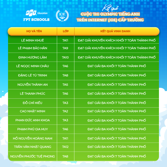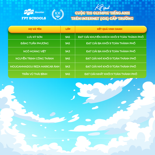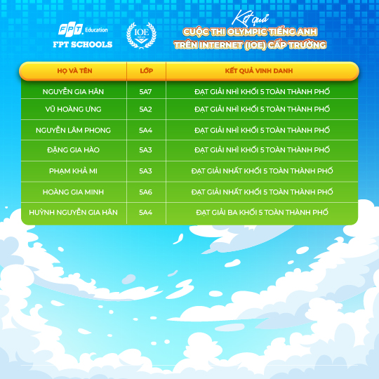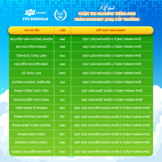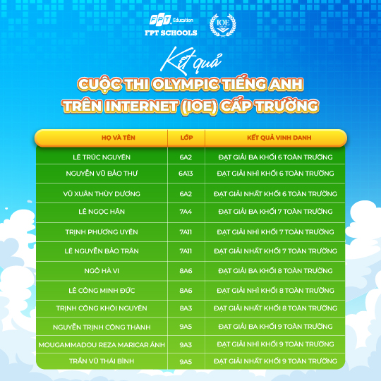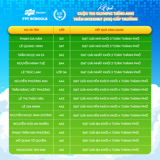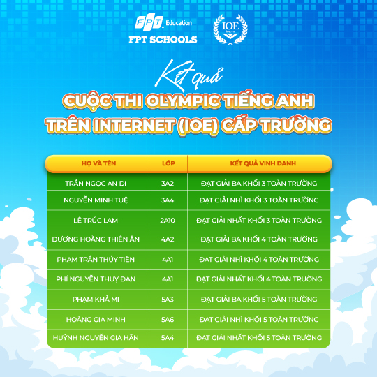 Nhà F xin chúc mừng các bạn học sinh được vinh danh với thành tích xuất sắc trong cuộc thi cấp Trường vừa qua. Vòng thi IOE cấp Quận/Huyện sẽ diễn ra vào 03 ngày 11-12-13/01/2024 sắp tới, các Fschoolers hãy tiếp tục giữ vững tinh thần chiến đấu để chinh phục vòng thi tiếp theo nhé!