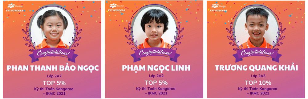 Lần đầu tiên tham gia cuộc thi toán quốc tế, các Ếch Cốm đến từ Trường Tiểu học FPT Schools Đà Nẵng đã xuất sắc mang về các giải thưởng lớn bao gồm: 03 giải Top 5% (Dành cho top 5% thí sinh có điểm cao nhất mỗi khối lớp), 01 giải Top 10% (Dành cho top 10% thí sinh có điểm cao nhất mỗi khối lớp) và 01 giải School Champion (Dành cho thí sinh có xếp hạng theo % cao nhất mỗi trường có trên 50 thí sinh đăng ký theo trường).