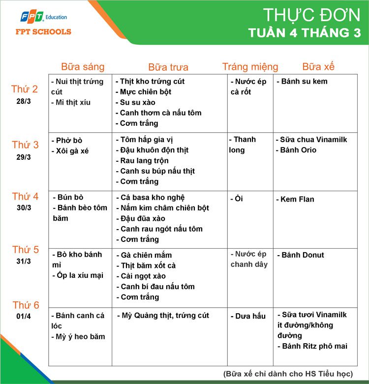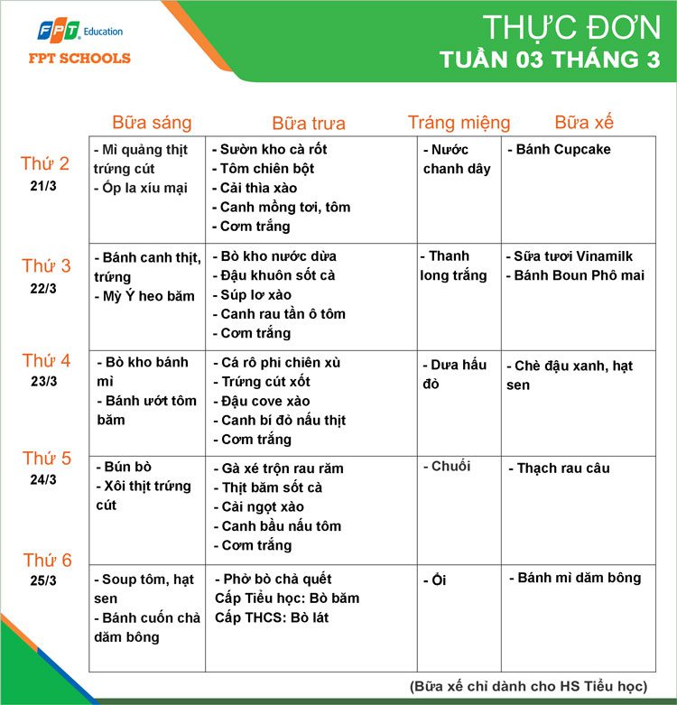 Thực đơn tháng 03 năm 2022 dành cho học sinh bán trú tại Trường Tiểu học và THCS FPT Đà Nẵng