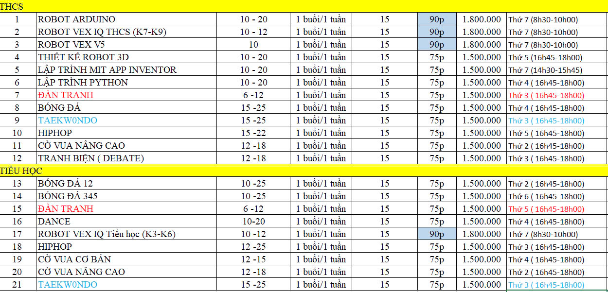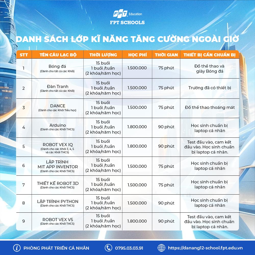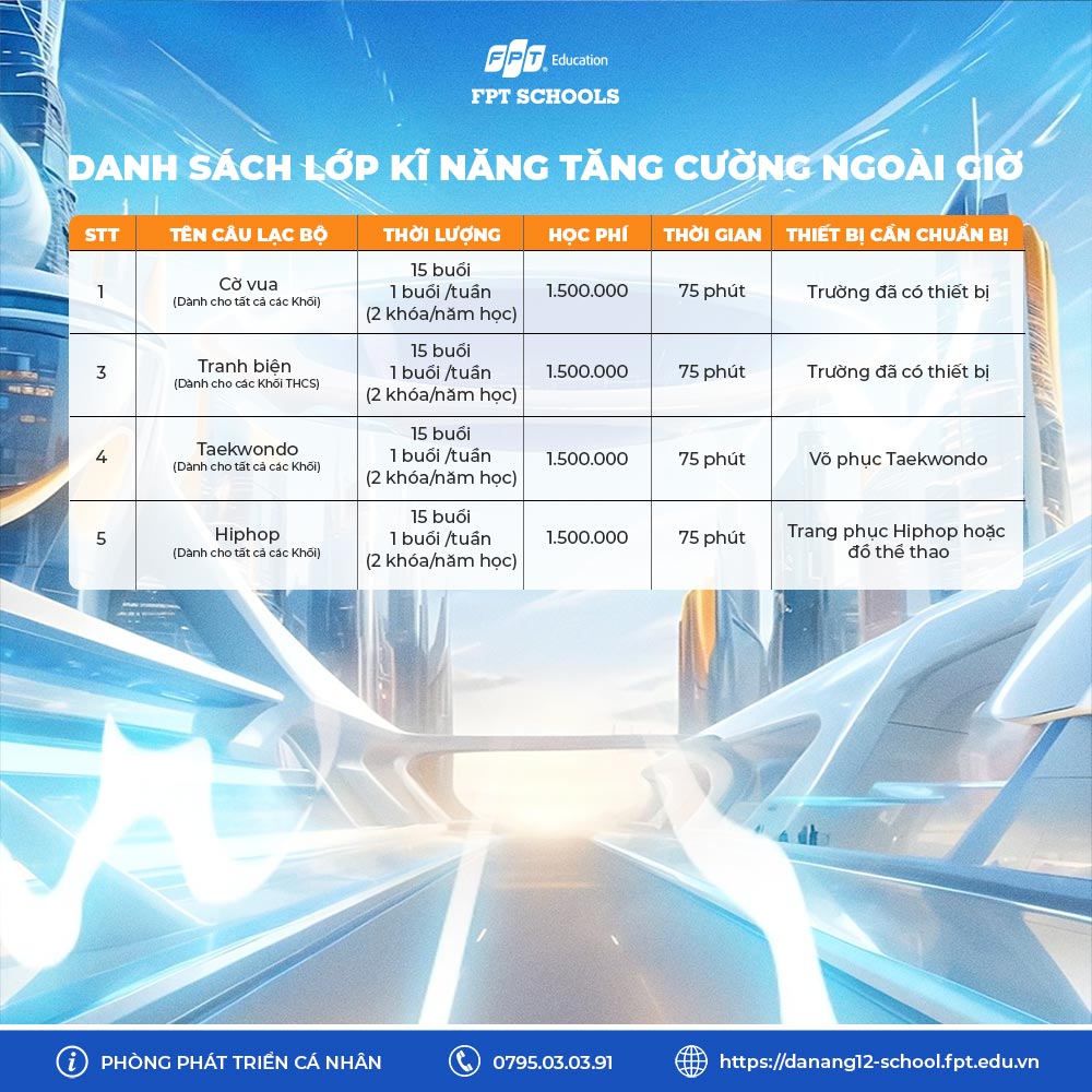Những lớp học này sẽ tạo ra một môi trường tuyệt vời để các bạn học sinh phát triển năng khiếu, rèn luyện thể chất, nâng cao kĩ năng sống và khám phá sở thích cá nhân. Hãy cùng nhau khơi dậy đam mê và khám phá tiềm năng của bản thân nhé!