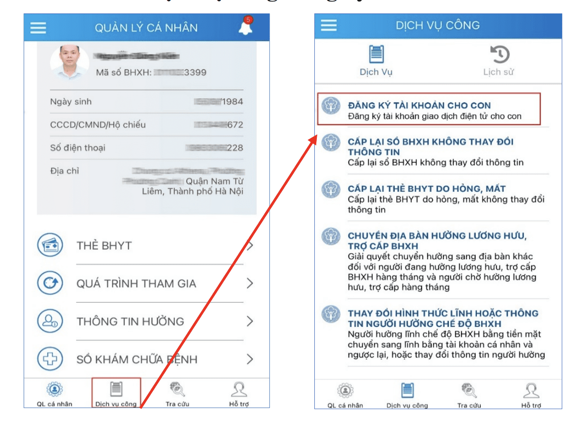 Bước 2: Chọn mục Dịch vụ công/Đăng ký tài khoản cho con 2