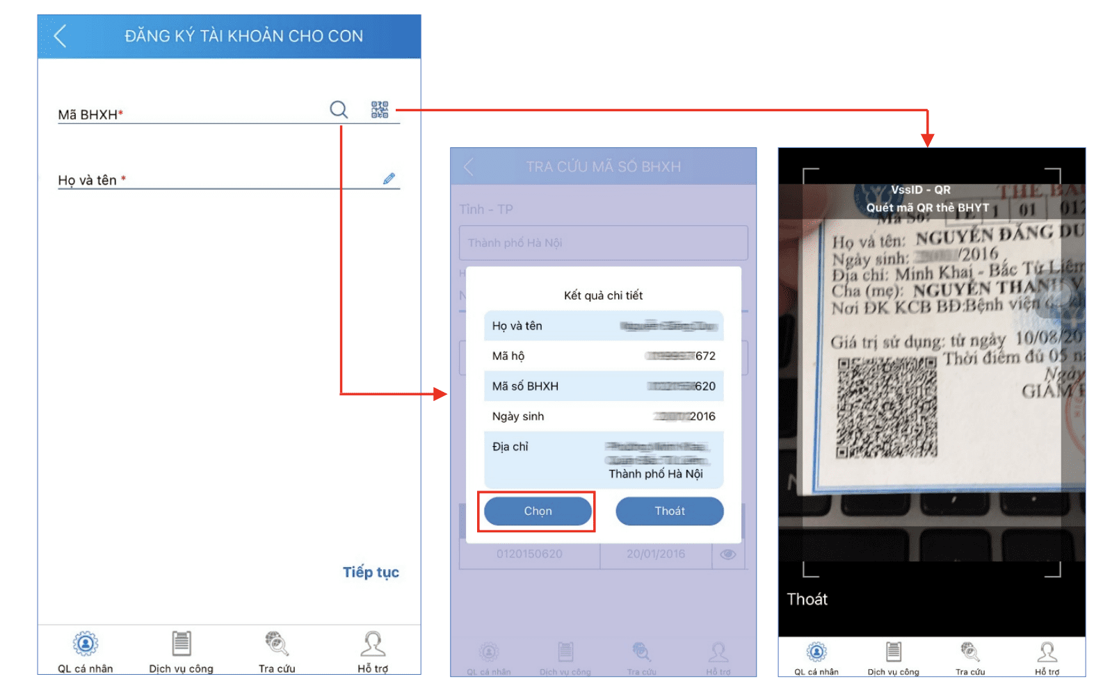 Có thể nhập trực tiếp hoặc sử dụng tiện ích tra cứu mã số BHXH hoặc quét mã QR thẻ BHYT để tự động điền thông tin mã số BHXH và họ tên.