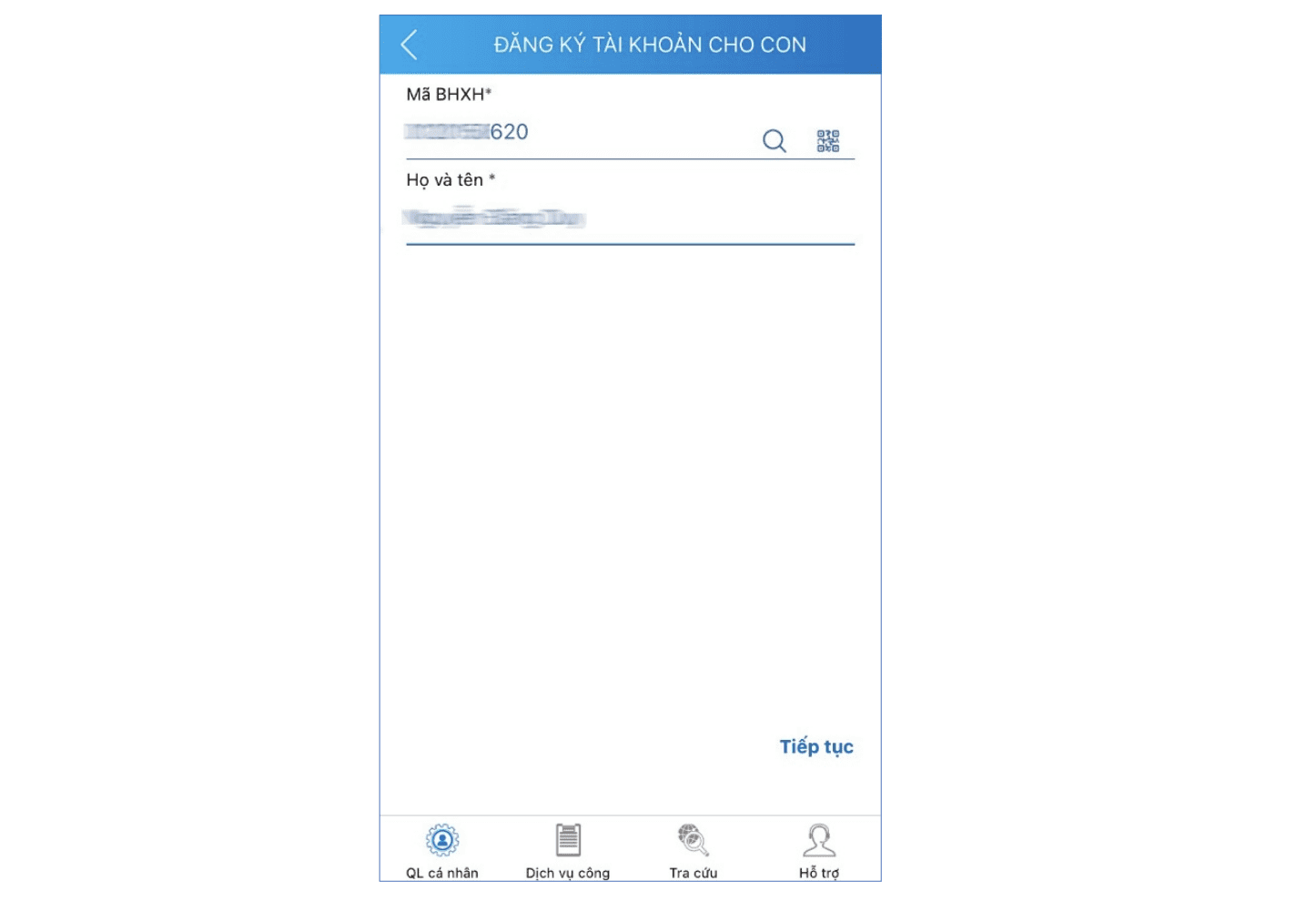 Bước 3: Nhập mã số BHXH và họ tên của con