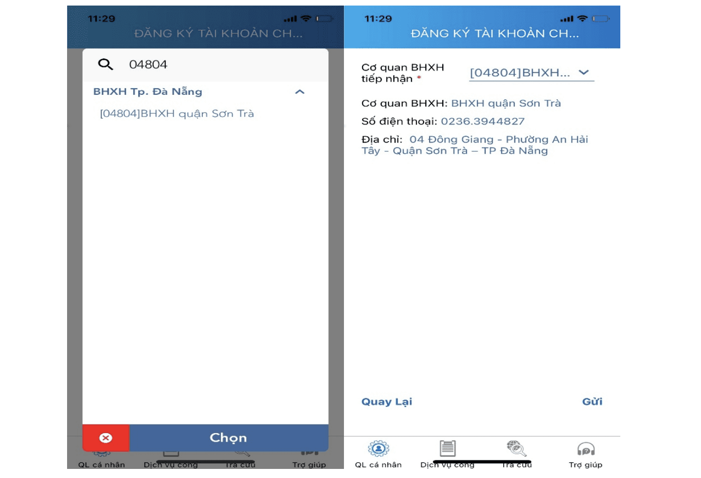 Bước 5: Lựa chọn mã 04804 để chọn cơ quan BHXH quận Sơn Trà để tiếp nhận tờ khai