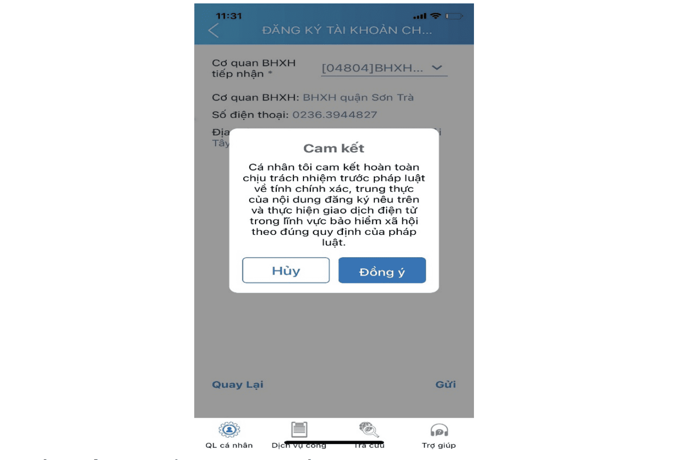 Hệ thống yêu cầu cá nhân đồng ý với nội dung sau: “Cá nhân tôi cam kết hoàn toàn chịu trách nhiệm trước pháp luật về tính chính xác, trung thực của nội dung đăng ký nêu trên và thực hiện giao dịch điện tử trong lĩnh vực bảo hiểm xã hội theo đúng quy định của pháp luật.”