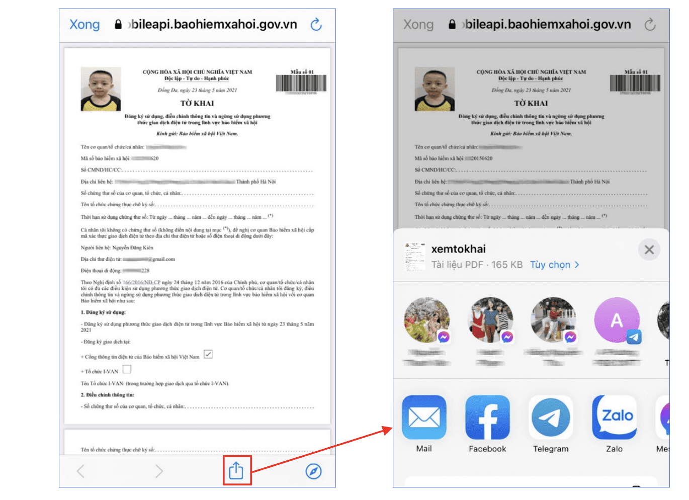 Cũng tại màn hình thông báo sau khi nộp tờ khai thành công, có thể bấm vào nút Xem tờ khai để xem chi tiết tờ khai trên thiết bị di động (có thể lựa chọn gửi tờ khai thông qua email hoặc các ứng dụng tin nhắn có trên thiết bị).