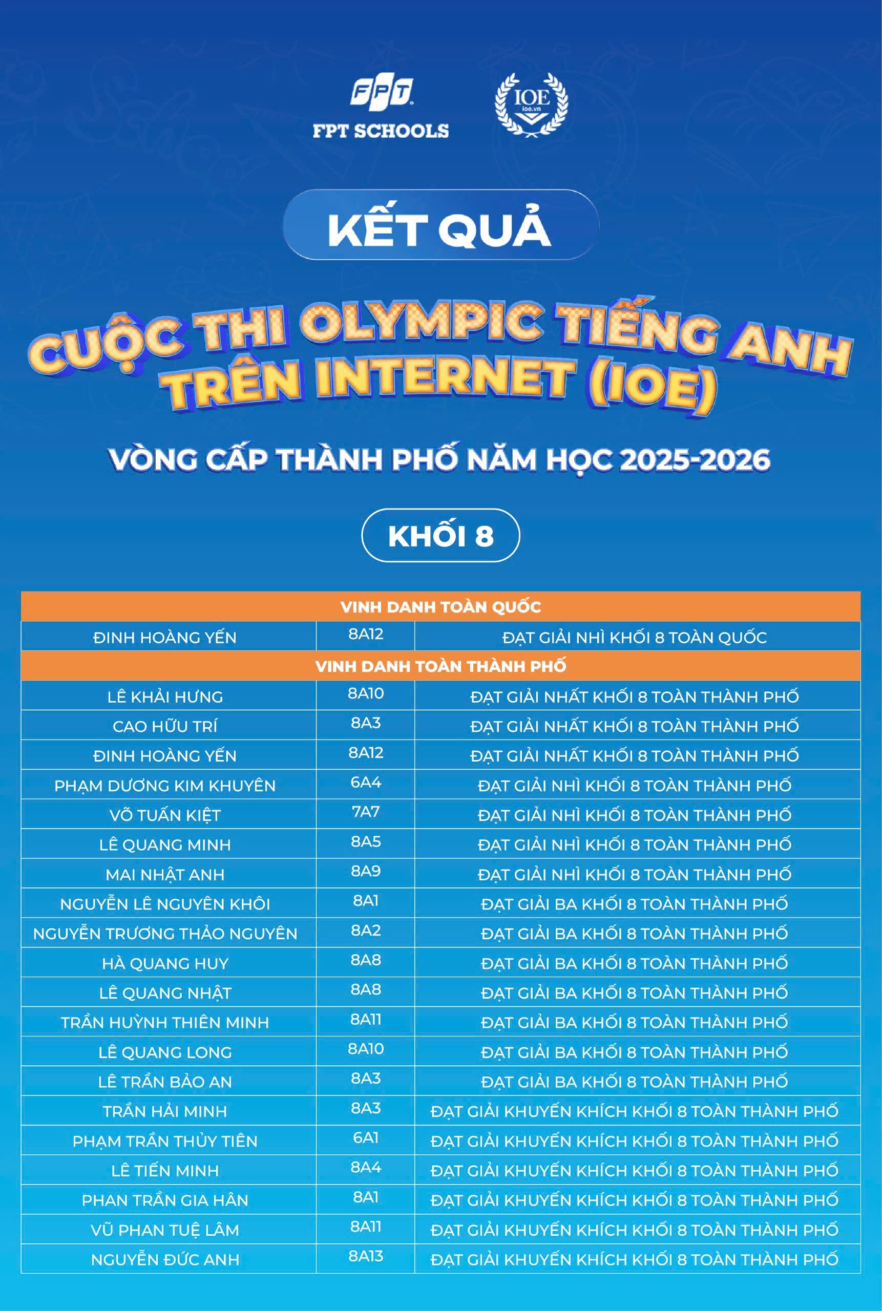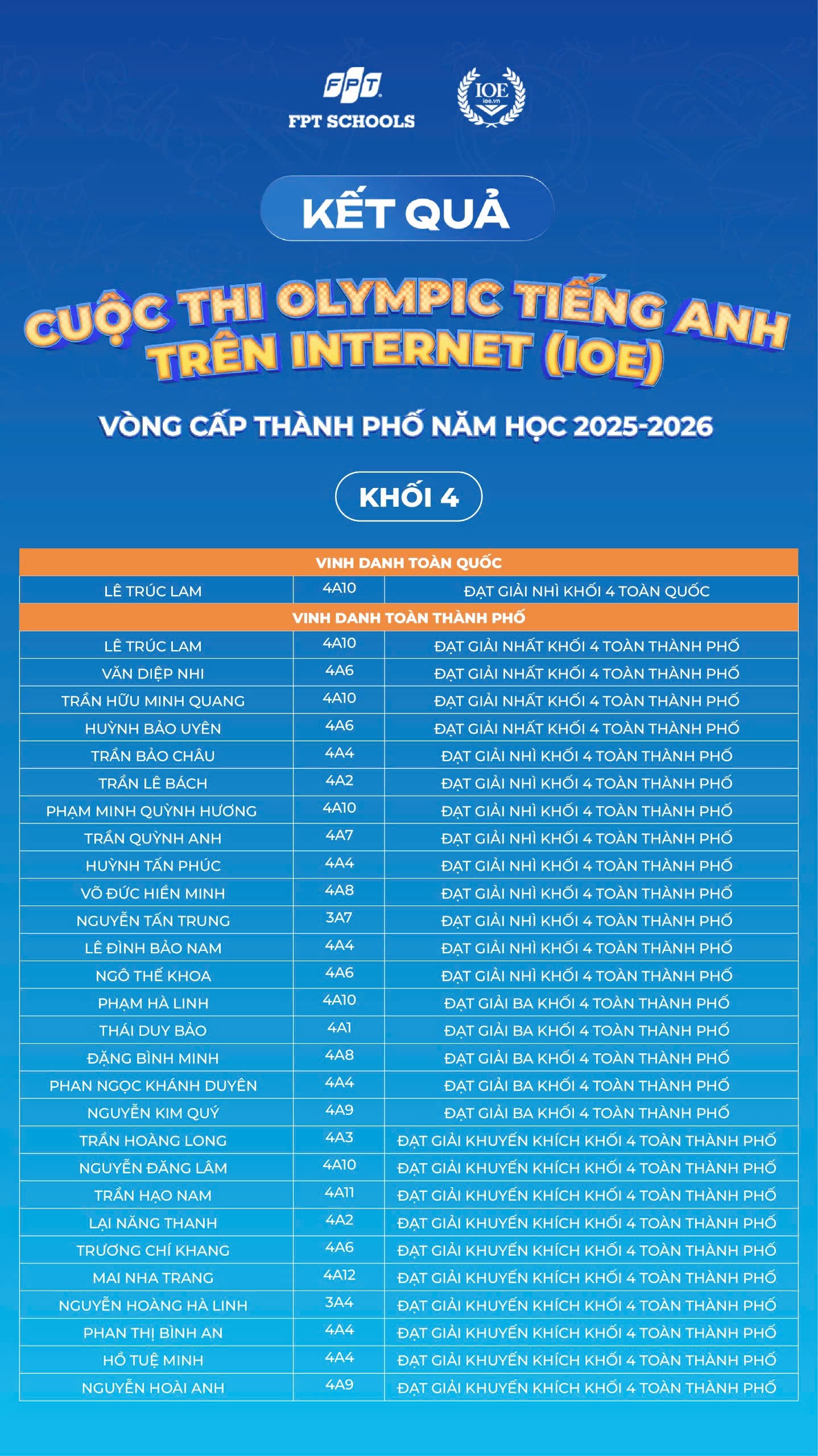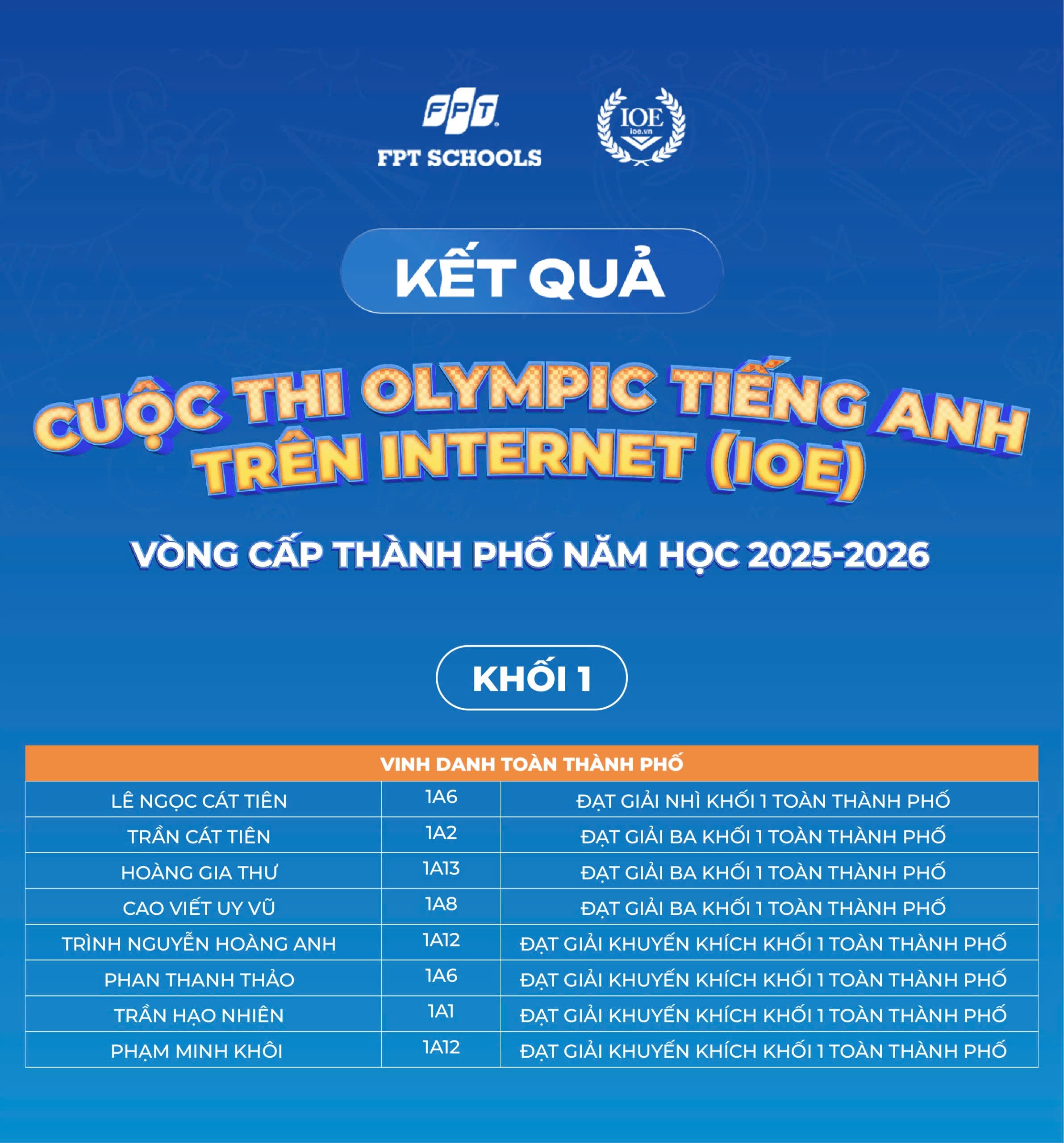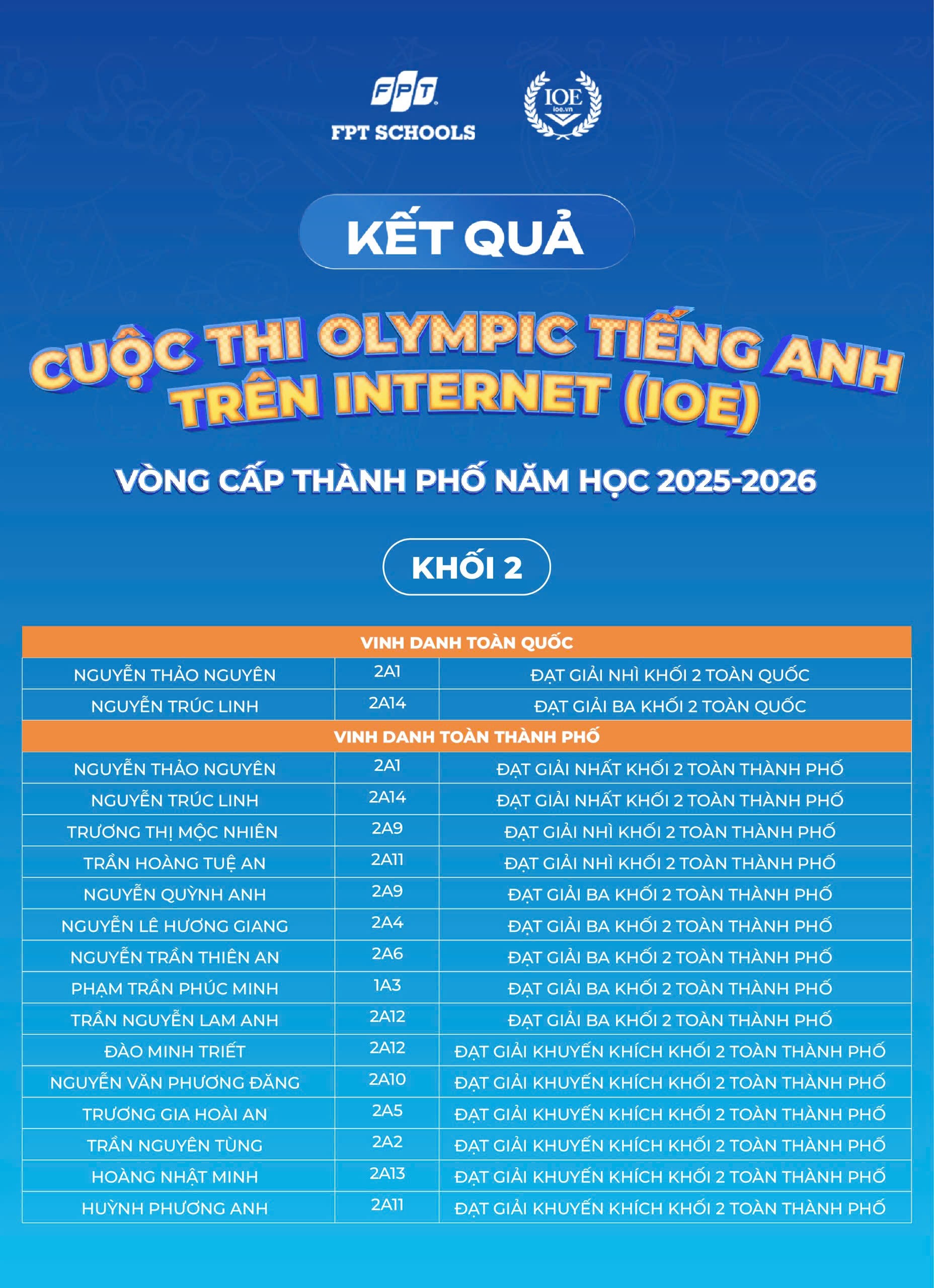 Nhà trường xin chúc mừng 179 Fschoolers đã được vinh danh tại cấp Thành phố. Tin rằng, đây sẽ là bước đệm để các em tiếp tục tự tin bứt phá và tỏa sáng trên hành trình chinh phục tiếng Anh phía trước!
