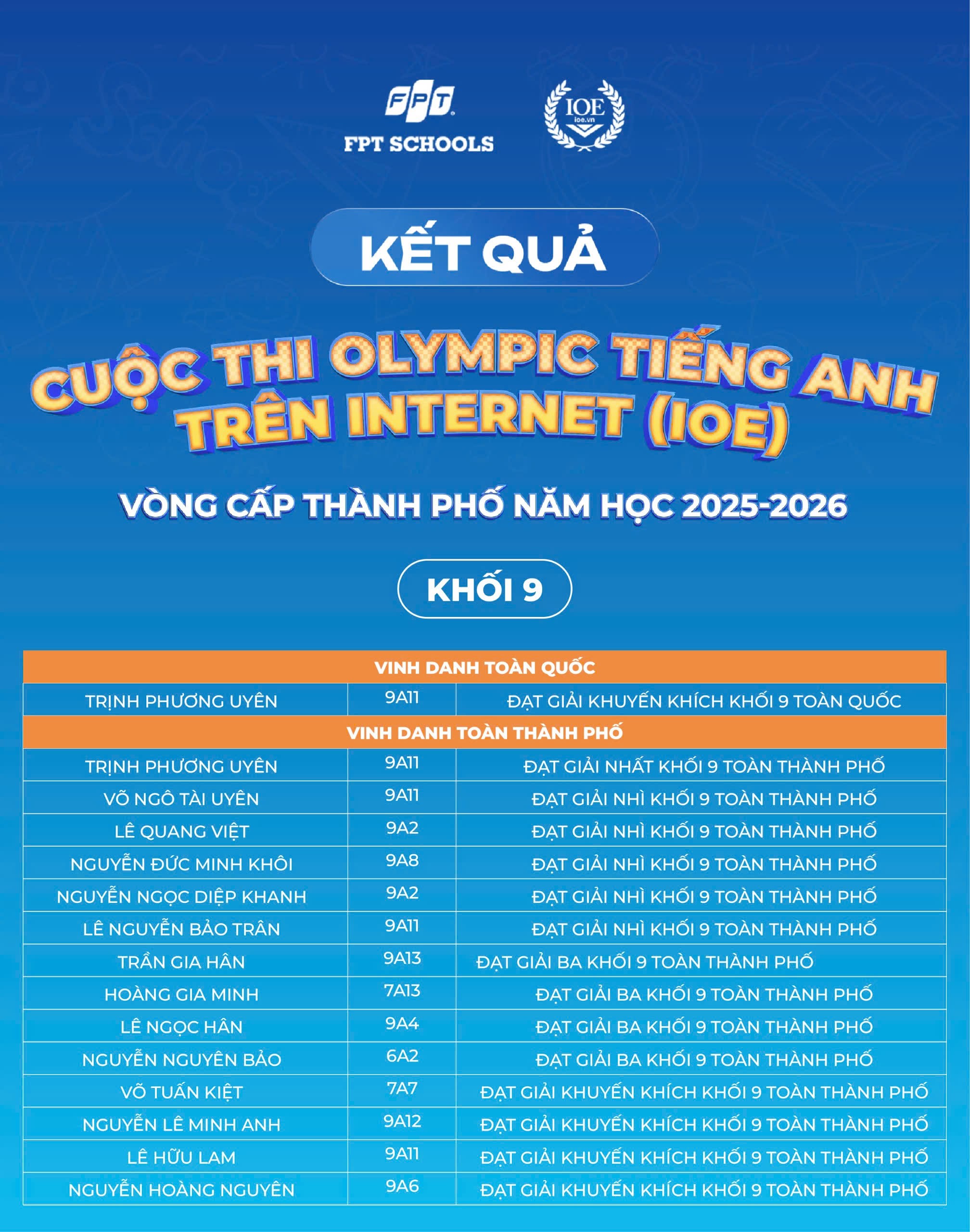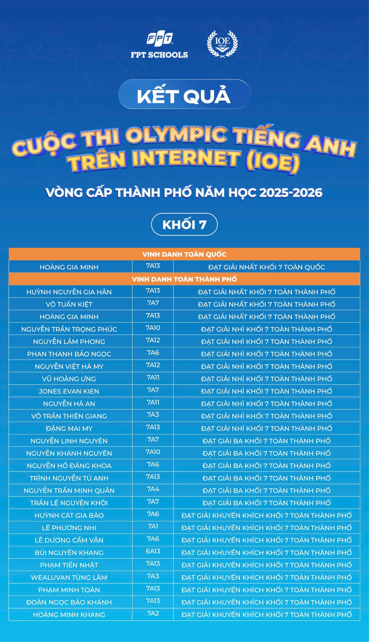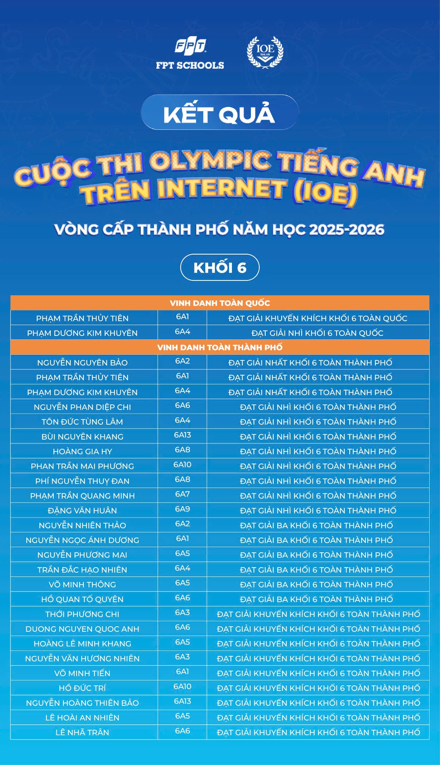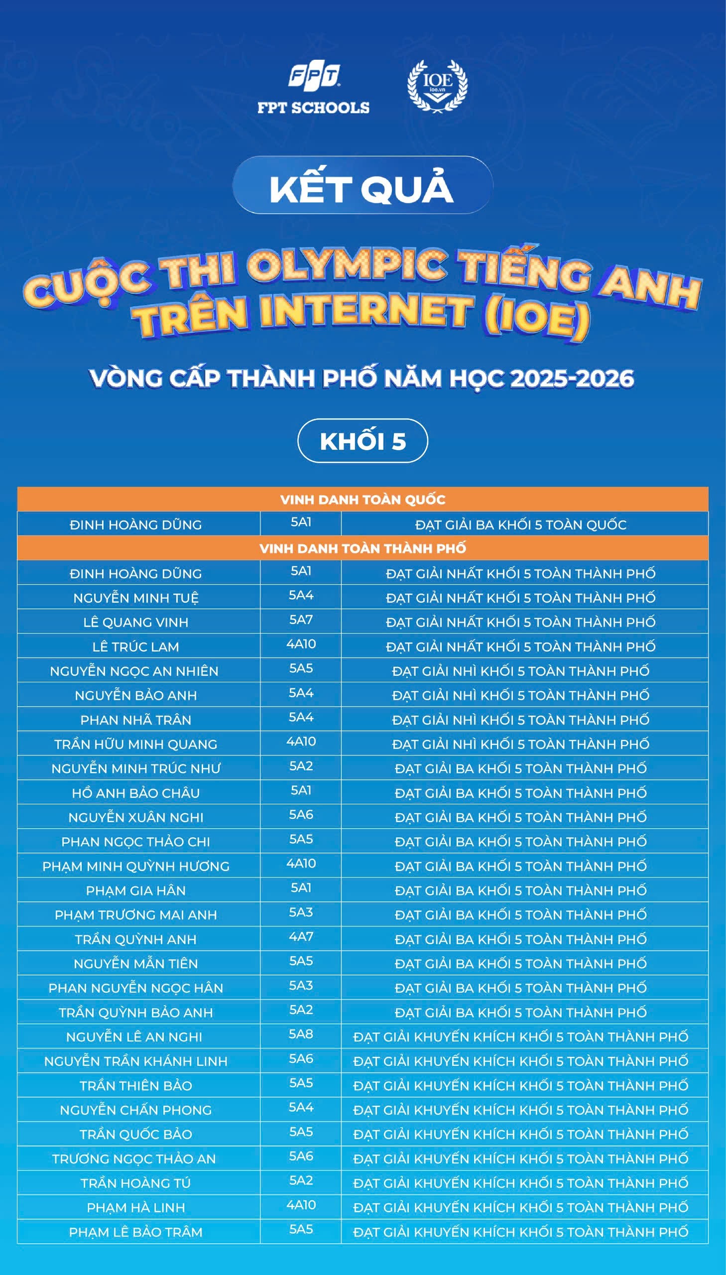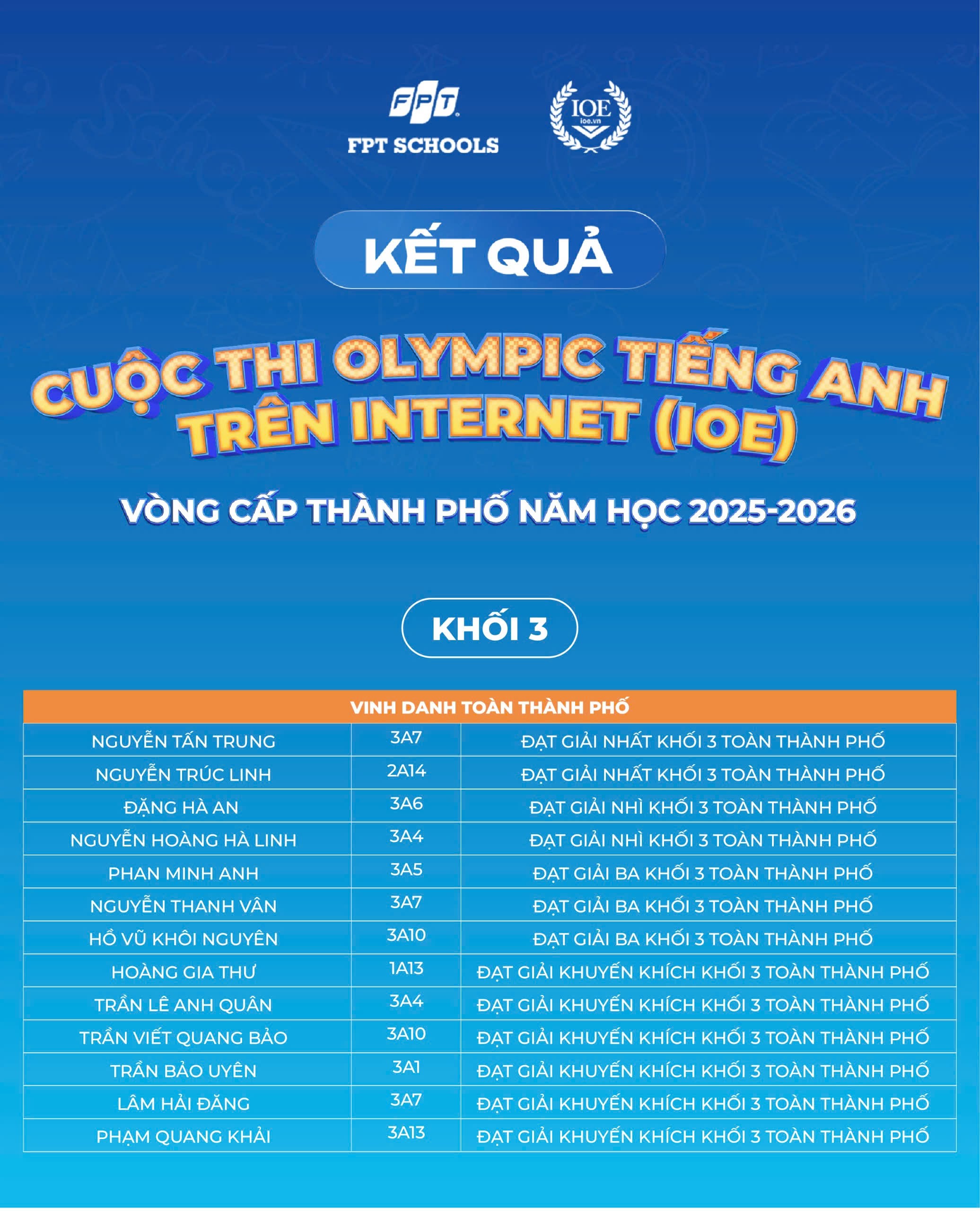 Nhà trường xin chúc mừng 179 Fschoolers đã được vinh danh tại cấp Thành phố. Tin rằng, đây sẽ là bước đệm để các em tiếp tục tự tin bứt phá và tỏa sáng trên hành trình chinh phục tiếng Anh phía trước!
