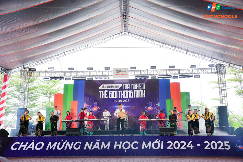 Lễ Khai giảng nổi bật với nhiều tiết mục đặc sắc, trong đó không thể không nhắc đến màn đồng diễn Vovinam mạnh mẽ, thể hiện tinh thần thể thao và sức mạnh của học sinh. Tiết mục hòa tấu độc đáo kết hợp giữa nhạc cụ hiện đại như guitar, drum và trống với nhạc cụ truyền thống như đàn tranh và đàn nguyệt đã tạo ra một bản giao hưởng hài hòa, thể hiện sự hòa quyện giữa âm thanh hiện đại và cổ điển. Đặc biệt, một điểm nhấn thú vị là việc sử dụng robot do học sinh chế tạo để mang dùi trống cho cô hiệu trưởng, làm cho tiếng trống khai trường trở nên đặc biệt hơn và thể hiện sự kết hợp hoàn hảo giữa công nghệ và truyền thống.