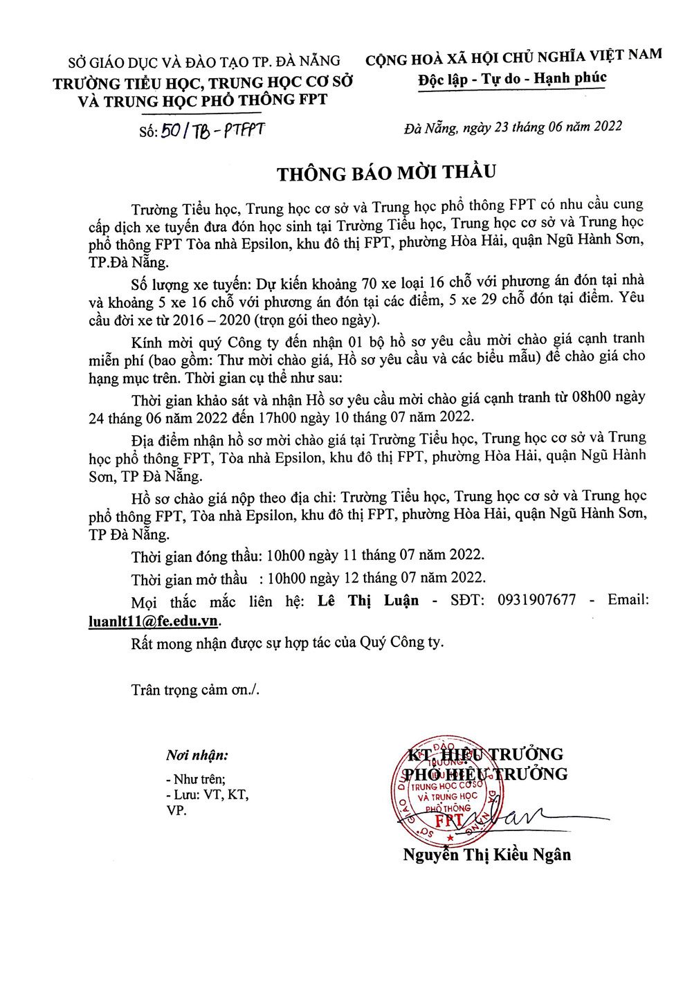 Thông báo mời thầu xe đưa đón học sinh năm học 2022-2023