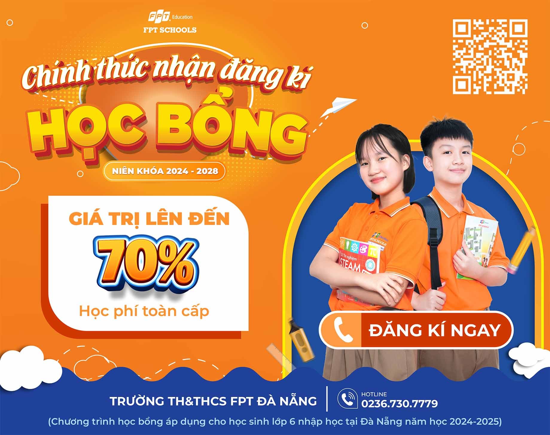 Năm học 2024-2025, Trường TH&THCS FPT Đà Nẵng áp dụng tổng giá trị Quỹ Học bổng và Ưu đãi đặc biệt lên đến 6,8 tỷ đồng. Theo đó, tất cả các bạn học sinh lớp 6 nhập học mới có thành tích xuất sắc trong học tập đều có cơ hội nhận được học bổng 30% - 50% - 70% học phí áp dụng cho toàn niên khóa 2024-2028. Chương trình tạo cơ hội trải nghiệm môi trường giáo dục toàn diện cho những học sinh xuất sắc trên địa bàn thành phố Đà Nẵng và các tỉnh lân cận.