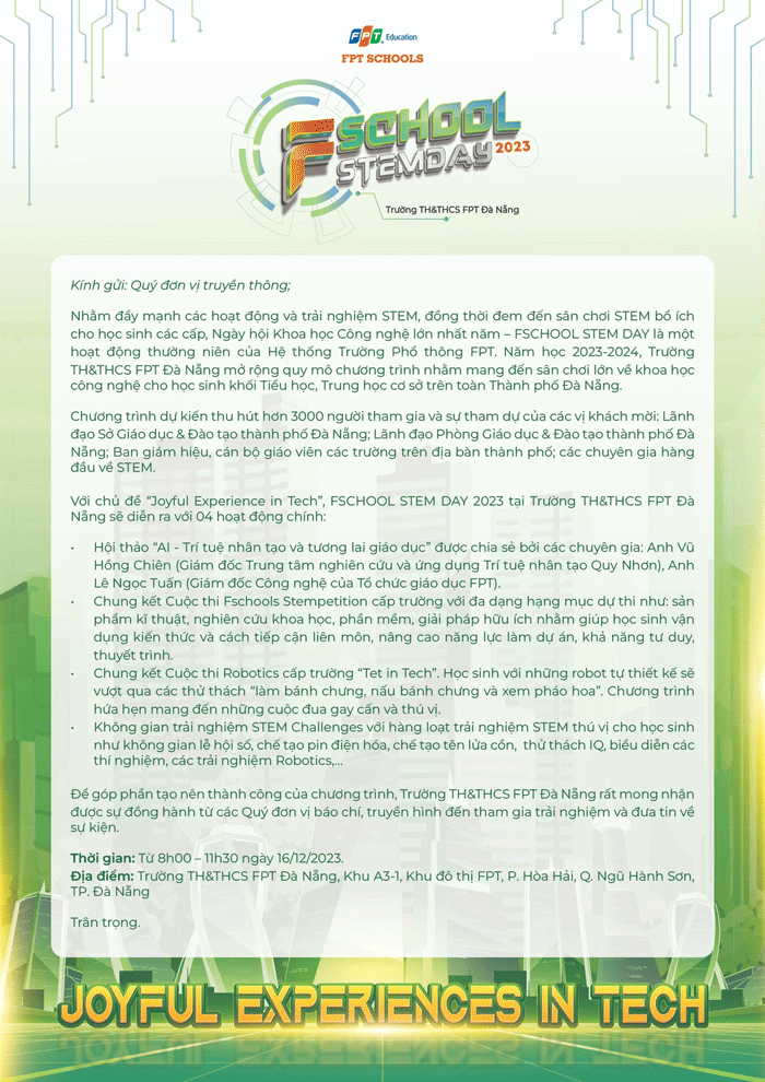 Nhằm khuyến khích học sinh chủ động nghiên cứu khoa học kĩ thuật và vận dụng kiến thức để giải quyết những vấn đề của thực tiễn cuộc sống cũng như tạo cơ hội để học sinh được cọ xát với những cuộc thi có quy mô, Trường TH&THCS FPT Đà Nẵng phát động Cuộc thi Khoa học Kĩ thuật cấp Trường năm học 2023-2024 đối với học sinh khối THCS.