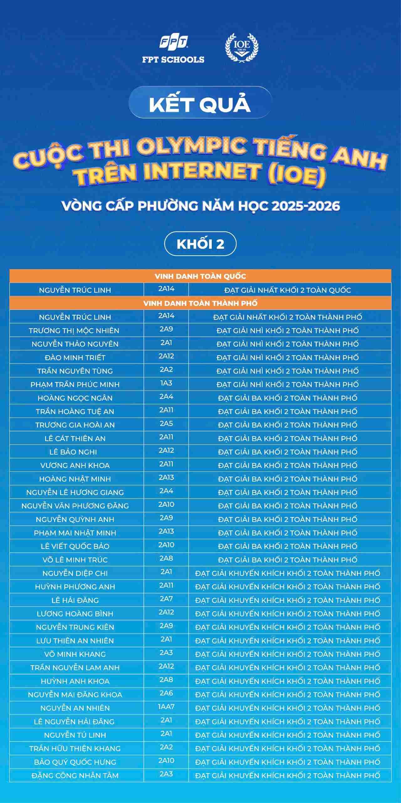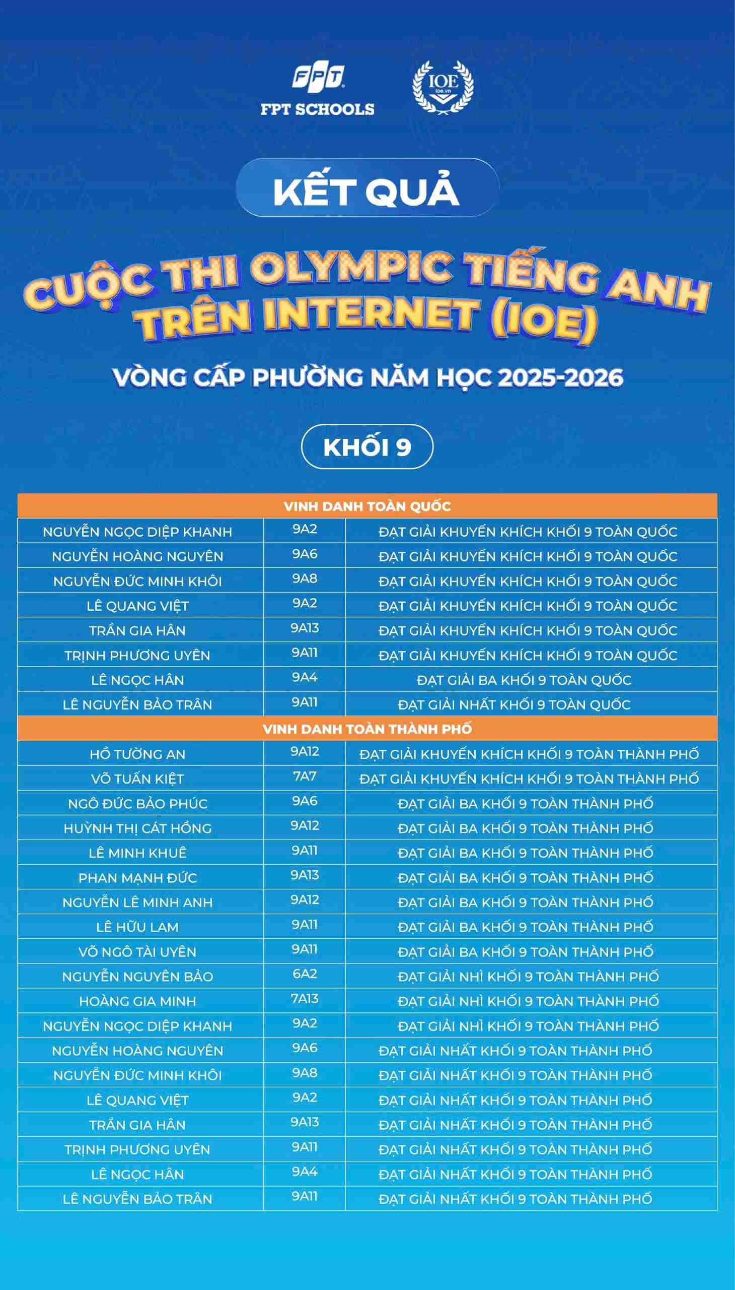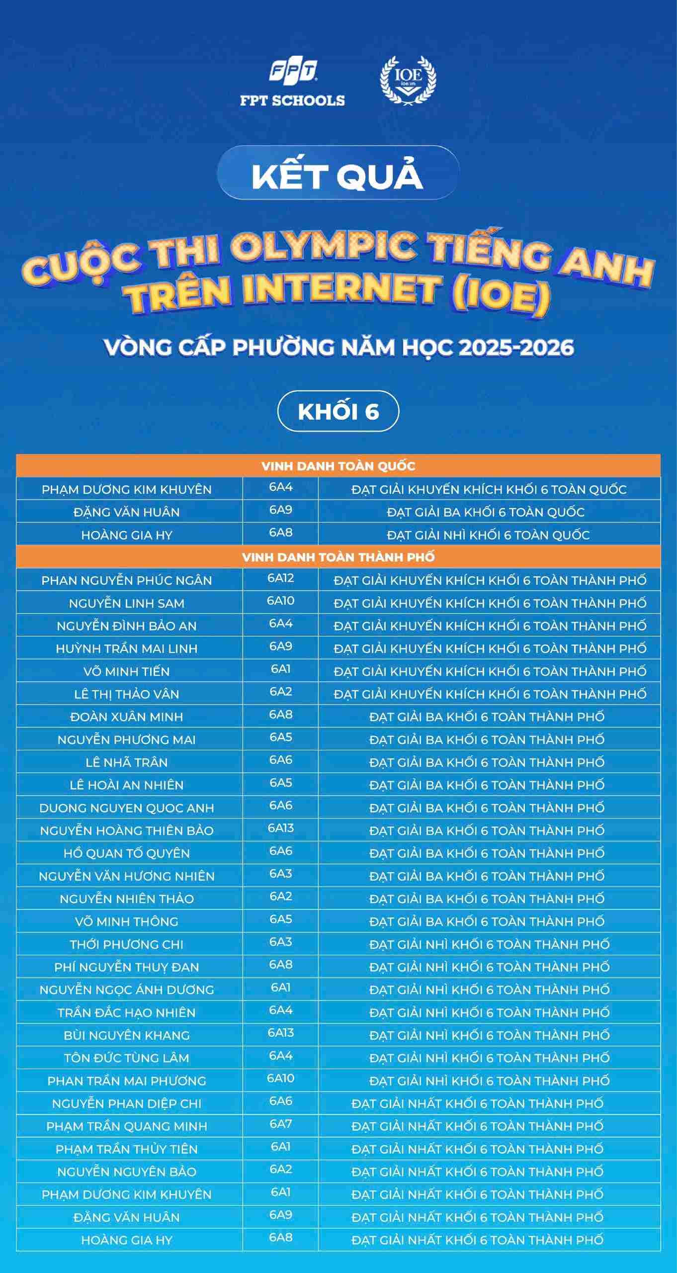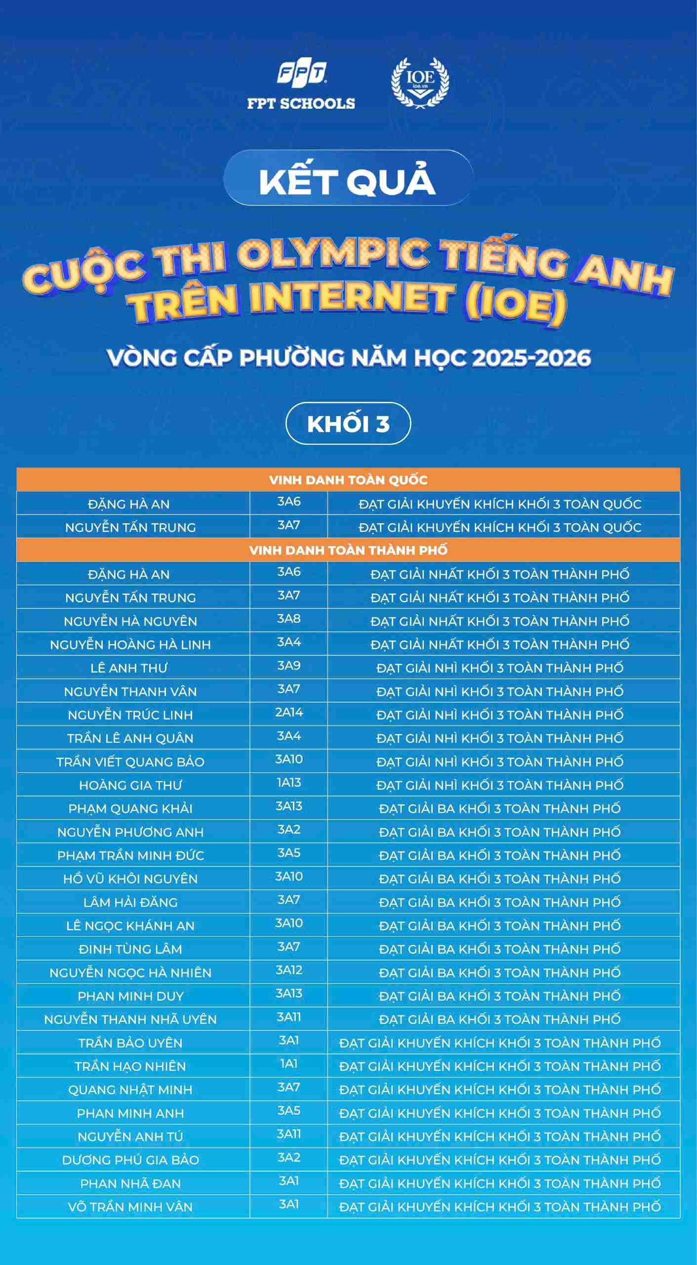 Xin chúc mừng 287 Fschoolers được vinh danh tại Vòng thi cấp Phường IOE năm học 2025–2026. Chúc các em tiếp tục giữ vững đam mê, sự tự tin và bản lĩnh để tỏa sáng ở những vòng thi tiếp theo trên hành trình chinh phục tiếng Anh!