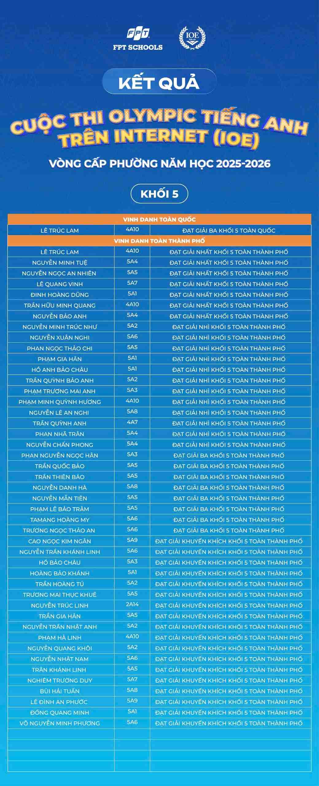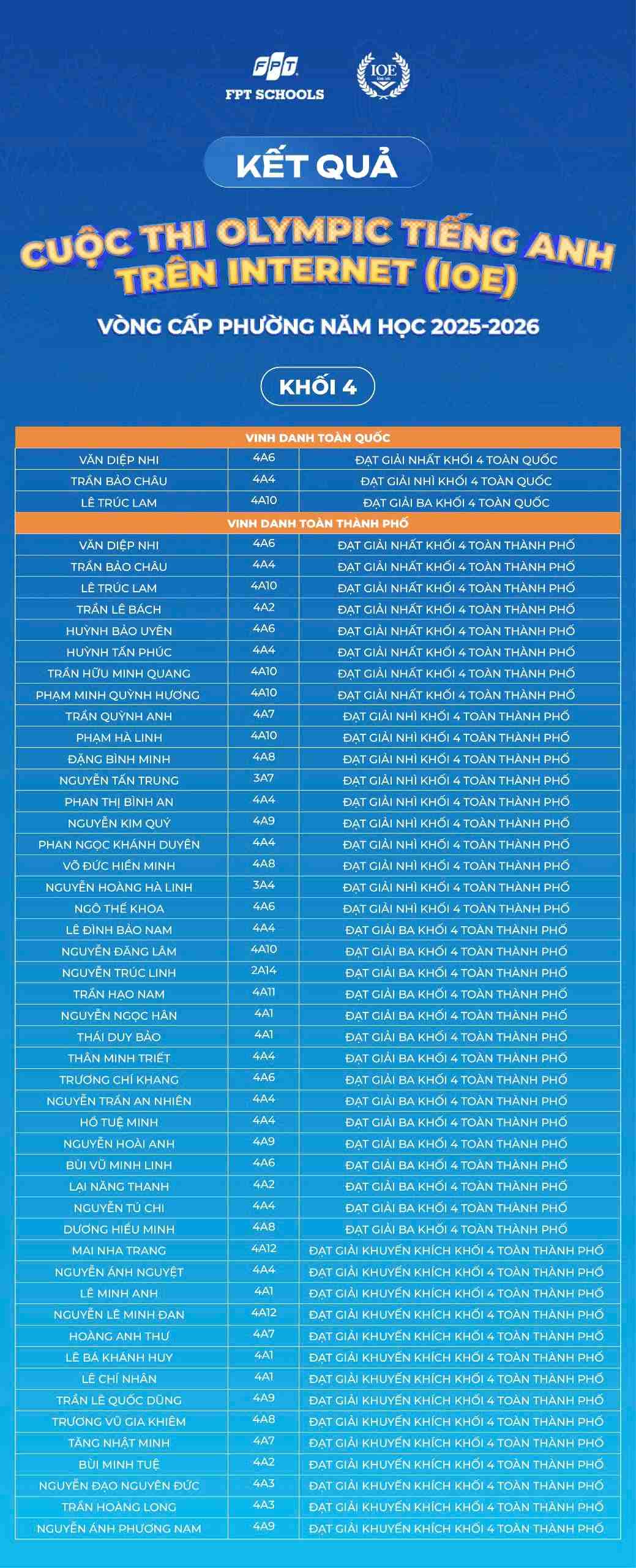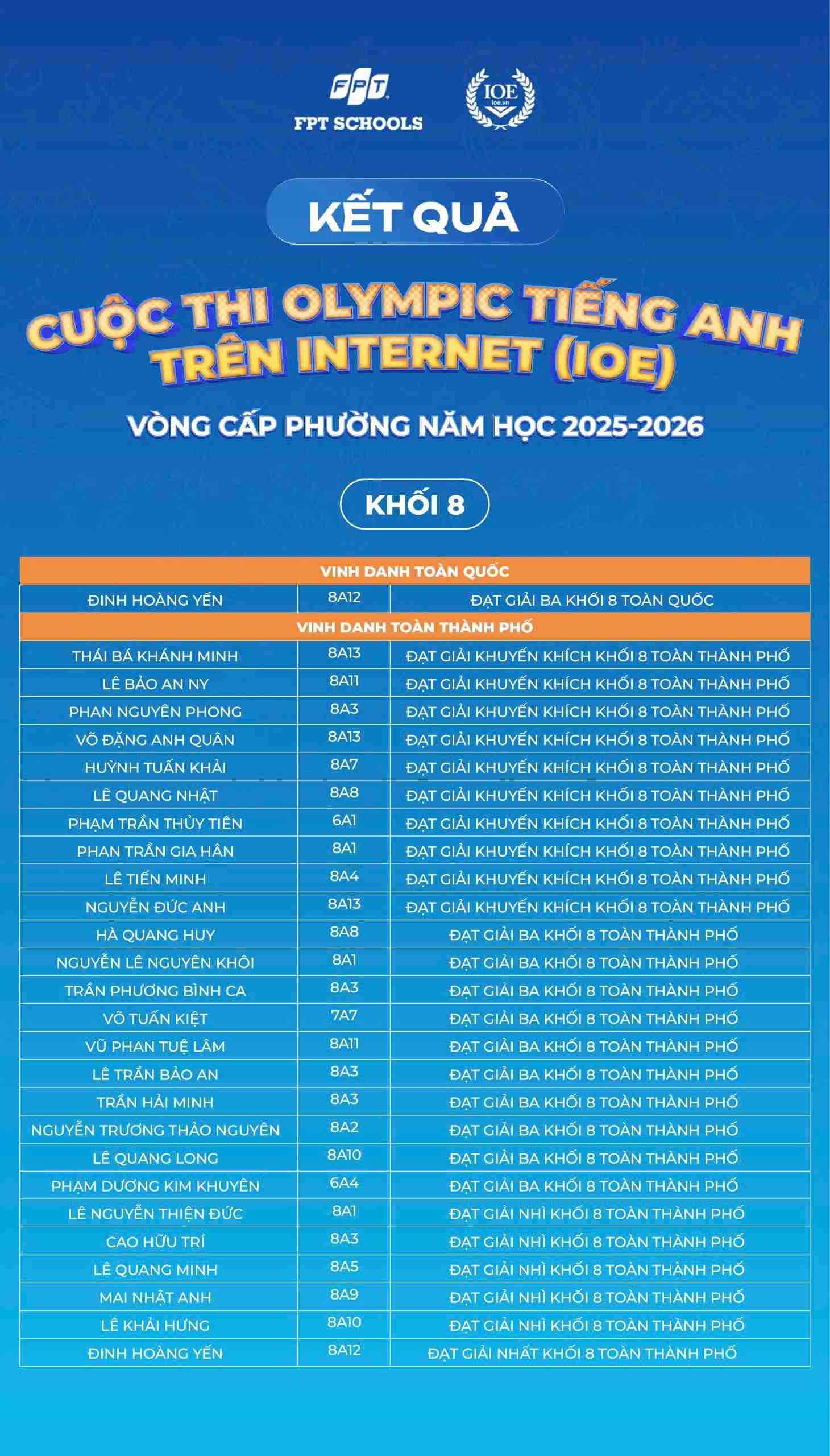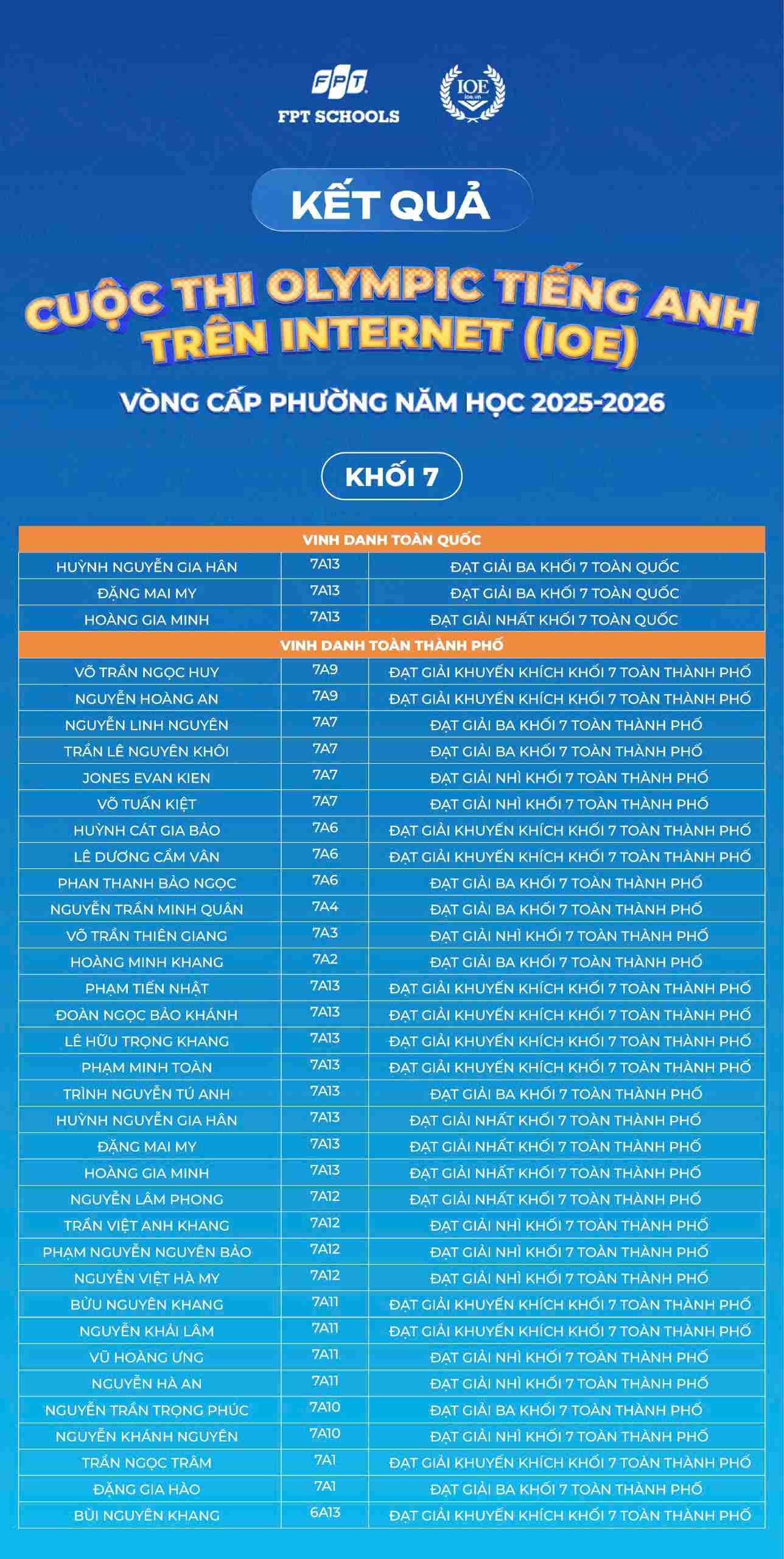 Xin chúc mừng 287 Fschoolers được vinh danh tại Vòng thi cấp Phường IOE năm học 2025–2026. Chúc các em tiếp tục giữ vững đam mê, sự tự tin và bản lĩnh để tỏa sáng ở những vòng thi tiếp theo trên hành trình chinh phục tiếng Anh!
